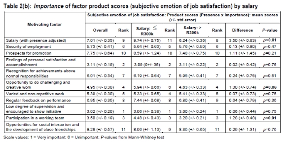 Table 1(a) reveals that (for both salary categories) the seven most important factors (amongst the 11) influencing the job satisfaction of both age groupings are (ranked in order of importance): personal satisfaction and accomplishment, a low degree of supervision and being encouraged to take the initiative, being part of a team, undertaking challenging work, receiving recognition for achievements above the ordinary, receiving feedback on past performance, and undertaking varied and non-repetitive work. Thereafter, slight differences of opinion become apparent between the two salary groupings, with the lower salary group favouring job security above either promotion or remuneration. The higher-paid group see remuneration level as being more important than either job security or promotion prospects. Differences in the mean rankings of the two groups are evident, but are not generally significant (p>0.20) - with the noteworthy exception of the importance of remuneration (p=0.02). In other words, although both groups rank salary as low in importance with respect to job satisfaction, they differ as to the degree.