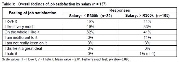 The data were analysed using SPSS for Windows. For the purposes of analysing salary and job satisfaction, differences were assessed by grouping respondents' remuneration into two categories, namely: those earning R300k or less per annum, and those earning more than R300k (Note: as at 1st October 2007, R14.00 = 1 Pound Sterling). These particular categories were selected as a majority of all respondents fell into the 'more than R300k per annum' grouping. Unless otherwise stated, percentages given below relate to the responses to individual questions.