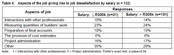 The relationship between salary and job satisfaction is not significant (p=0.32). Although the vast majority of participating quantity surveyors appear to like the work they undertake, discernible differences do exist between the two groups of respondents, albeit not significant (p=0.095). Thirty five percent of those earning not less than R300k per annum report that they 'like it very much' or 'love it', compared to 44% of the older group (see Table 3). Comparatively few quantity surveyors from both groups experience high levels of job dissatisfaction at all times; certain aspects of the work obviously giving rise to job dissatisfaction to a greater or lesser degree -most notably the measurement of builders' work, the preparation of final accounts, and project administration (see Table 4). The differences between the groups are not significant (p=0.64). Reasons cited by both groups under 'Other' included: perceived incompetence of other professionals; poor documentation from, and lack of faith in, designers; bureaucracy; dealing with government officials (political interference); contractual disputes; professional appointments made on the basis of affirmative action; and dealing with 'incompetent' emerging contractors. A female respondent reported disparaging attitudes displayed towards 'White' women by 'Black' male clients.