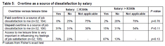 The findings indicate that the majority of the respondents may be considered to be less than 45 years old, 'White', males, South Africa citizens, senior professionals, with considerable experience. Most consider themselves to be paid an average, to above average, salary. The majority (76%) earn above R300000 per annum. Although differences are apparent between the two salary categories with respect to the demographic variables, these are only significant in the cases of age group (p<0.01) and years of professional experience (p<0.01). Interestingly, whilst not significant at the 95% level, the relationship between salary category and race is discernible (p=0.055). Insofar as salary as a motivating factor is concerned, a majority of both salary categories (< R300k: 63%; >R300k: 74%) claim that salary is 'important' to 'very important' in influencing feelings of job satisfaction. However, the difference between the two groups is significant (p<0.05). A function of professional life is the requirement to sometimes undertake overtime (paid or unpaid) to meet the work demands of the organization. Overtime is invariably done at the expense of leisure and family time. Very few quantity surveyors in either salary category view being required to do paid overtime as a source of job dissatisfaction (p=0.78) (see Table 5). Having to do unpaid overtime is a source of job dissatisfaction to nearly 31% of those earning R300k or less, and to 15% of their higher-earning colleagues, with no significant differences between the two groups (p=0.11). Overwhelmingly (< R300k: 78%; >R300k: 87%), participants see access to their leisure time as being very important in influencing feelings of job satisfaction (p=0.13). Clearly, Quantity surveyors value their leisure time and unpaid overtime, whether voluntary or involuntary, is a source of job dissatisfaction for many.