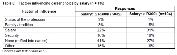 Regarding reasons for choosing a career in quantity surveying (see Table 6), many respondents (< R300k: 41%; >R300k: 27%) report 'drifting' into the career. Salary, despite its comparative lack of perceived importance as a factor influencing job satisfaction, is cited as a main driver (< R300k: 22%; >R300k: 31%) for having chosen a career in quantity surveying. 'Other' reasons included: a liking for working outdoors; a love of buildings and architecture; an interest in the construction sector; an interest in property and property development; an aptitude for figures; and as a result of an aptitude test. The perceived status of the profession had the least influence of all (< R300k: 3%; >R300k: 1%). The differences between the two groups are not significant (p=0.18).