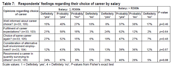 Table 7 indicates the two groups of quantity surveyors' opinions (with the benefit of hindsight) regarding issues relating to their choice of career. Aspects covered are: were they well informed about a career in quantity surveying; has their career to-date fulfilled their expectations; would they choose the same career again; would they consider moving to another type of career in the built environment; and would they recommend a career in quantity surveying to others?