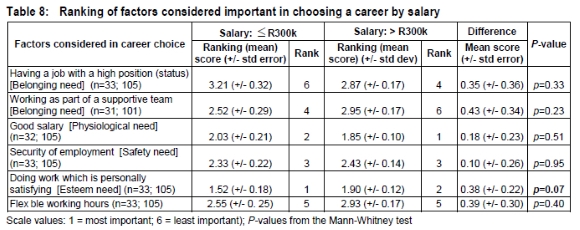 The importance, when choosing a career, of doing work that is personally satisfying (esteem need) and of being paid a good salary (physiological need) are confirmed (see Table 8). These two attributes were given the highest rankings and their standard errors confirm a significant difference between these two factors and the rest. In contradiction with the findings relating to the importance of factors giving rise to job satisfaction (see Table 1(a)), physiological needs (salary) is ranked as comparatively important (no difference between the groups with p=0.51). Interestingly, a discernible difference exists between the two groups with respect to doing work that is personally satisfying (p=0.07); with the less paid grouping seeing it as more important. It would seem that the importance of salary changes over time with increased maturity and self confidence in one's worth. Interestingly, no significant difference between the groups is apparent regarding the importance of flexible working hours when deciding upon a career (p=0.40).