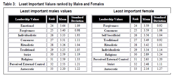 Table 3 provides the ten least important values ranked by both males and females. The values identified by both males and females as least important are forgiveness, individualistic, consensus, ritualistic, traditional, strict, religious, perceived external control and autocratic. However, males include emotional amongst their least important while females include self-sacrificial. The nine values shared by both male and female respondents as least important are predominantly Western values, except for two African values, namely ritualistic and autocratic.