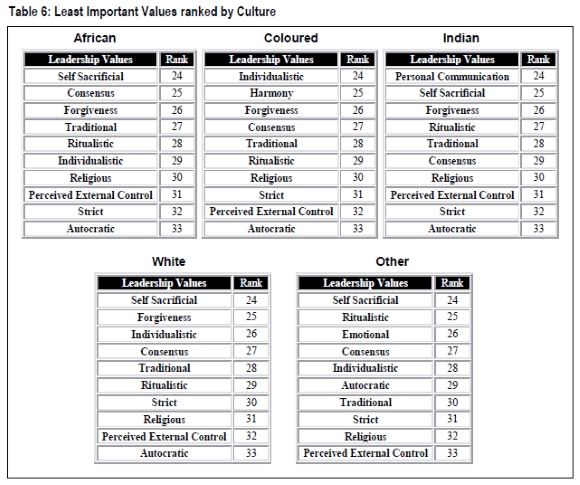 The leadership values listed as the most (table 5) and the least important (table 6) according to culture clearly indicate that the rankings are fairly similar in that the leadership values may not be in the same order, but generally the list contains the same values for all the cultural groups, especially the least important values.