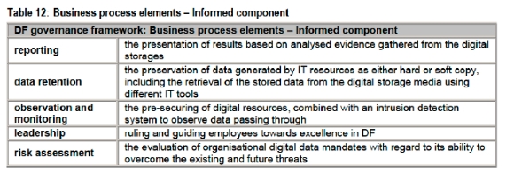 The DF governance framework is presented together with its components (see Figure 3). The intention is that the implementation of this framework will result in better DF governance within any organisation. The preliminary framework is a preliminary outline that can be further refined with future research, and can be modified to suit specific needs of individual organisations.