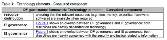 The fourth governance discipline depicted in Figure 1 is DF governance. DF governance is a specialised sub-discipline of IT governance, with some overlap with corporate governance and IS governance. Section 5 will address this discipline in detail.
