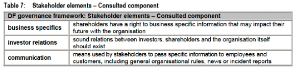This research paper builds the DF governance framework on the RACI matrix, addressing Responsibility, Accountability, Consultation and Information (Mueller & Phillipson 2007: Internet). A RACI matrix is a chart of all the activities or decision making authorities undertaken in an organisation set against all the people or roles. At each intersection of activity and role it is possible to assign somebody responsible, accountable, consulted or informed for that activity or decision. Responsible indicates the person who performs an activity or does the work; Accountable indicates the person who is ultimately accountable and has Yes/No/Veto; Consulted indicates the person that needs to feedback and contribute to the activity; and Informed indicates the person that needs to know of the decision or action (Morgan 2008: Internet).