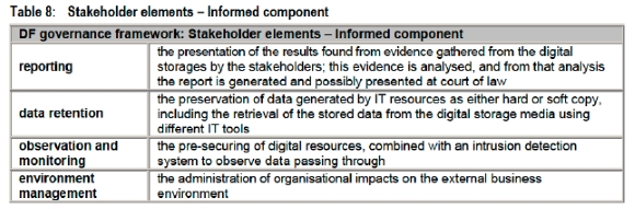 DF governance should not be a standalone framework within the organisational governance structure. All parties involved should work cooperatively with other parties within the specific field to ensure successful governance (ISACA 2006:20). This will ensure quick and efficient handling of IS breaches with in-house forensic expertise. Proper training in this regard will limit the potential negative impact security breaches may have on an organisation's public reputation. In accordance with this forensic training, investigators can be measured with regard to their compliance with the international standard, ISO 27037 Guidelines for identification, collection and/or acquisition and preservation of digital evidence. At the time of writing, this standard was only available in draft version.