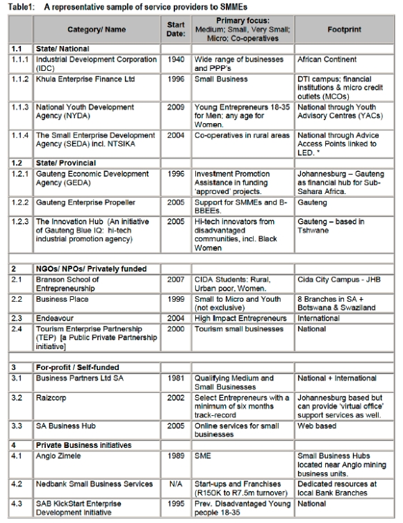 Therefore this survey is not intended to be a comprehensive and definitive study of all service providers to SMMEs, but rather a partial sample of the main categories under which service providers can be included, as listed in the Abstract.