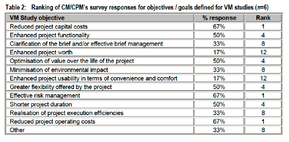 Value management studies can occur at various stages of a project and can be undertaken for a variety of reasons. Participants were presented with a list of VM objectives or goals drawn from the literature (e.g. Kelly et al 2004; Kelly 2007) and requested to indicate which of those factors had been the focus (objective) of VM studies with which they had personally been involved. The results are shown in Table 2.