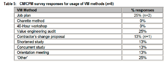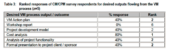 Respondents were questioned regarding desired outcomes expected to flow from VM studies on projects. A range of outcomes were provided, namely, a VM action plan; workshop report; project development model; cost analysis of the project; analysis of project functionality; a formal presentation to the project client / sponsor; and 'Other'. The results are shown in Table 3. In responding to this question, the CMs and CPMs displayed a clear preference for a cost-based outcome, favouring a detailed cost analysis (80%) above all others. The remaining outputs did not enjoy majority support (< 40%). No additional suggestions were offered under 'Other'.