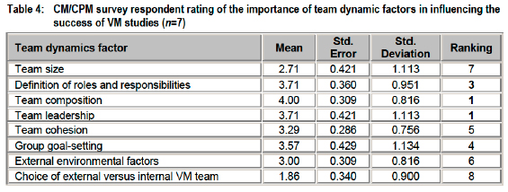 Given the importance of team dynamics in effective VM (see Fong, Shen & Cheng 2001; Leung et al 2003; Yu, Shen, Kelly & Hunter 2007), respondents were presented with a number of factors relating to team dynamics (e.g., team size, definition of roles, external versus internal VM team) and asked to rate their significance in terms of influencing the success of the VM exercise (1 = completely insignificant; 5 = extremely significant). The results are depicted in Table 4.