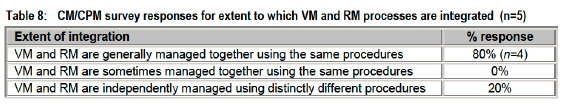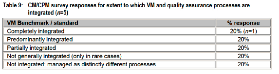 Ellis et al (2005) point to the integration of VM and risk management (RM) in practice, reinforcing the findings of Hiley and Paliokostas (2001) that practice is ahead of theory in this respect' (Ellis et al 2005:491). Interestingly, 80% of the respondent CMs and CPMs (n=5) reported that VM and RM are integrated and generally managed together as part of the management system (20%) stated that are independently managed). The results are shown in Table 8. Finally, participants were questioned regarding the extent to which VM is integrated with quality assurance procedures such as TQM and Six Sigma. The results are depicted in Table 9 (n=5). Integration is fairly widespread, but a large proportion (40%) reported integration at most only in rare instances. Only one respondent claimed complete integration.