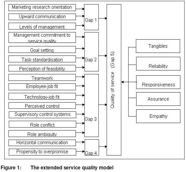 A quality framework should show areas for quality improvement, a link to customer satisfaction, the need for the training, education and development of employees and its use for benchmarking purposes (Seth, Deshmukh & Vrat 2005:915). There are a number of service quality frameworks and models and, according to Seth et al. (2005:943) very few meet all the requirements. One of the most popular service quality frameworks was developed by Parasuraman, Zeithaml and Berry. This is shown in Figure 1. This model was developed on the principle that service quality is a summation of differences (gaps) between the expected and received quality factors, which is equivalent to the summation of the quality performance gaps of the various organisational activities used to implement quality (Zeithaml, Leonard, Berry & Parasuraman 1988: 35). The quality of service factors are tangibles, reliability, responsiveness, assurance and empathy.