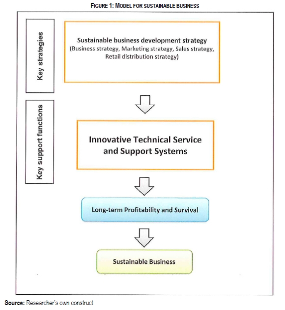 The model indicates that implementation of a sustainable business development strategy requires managers to develop a combination of different functional strategies namely, business strategy, marketing strategy sales strategy and retail distribution strategy, all of which should be associated with providing customer-specific needs. The reason for this strategic approach is that combination of innovative strategies that are developed to provide cutting-edge technology-driven products, an all-inclusive service offering and a comprehensive technical support system cannot easily be duplicated by the competition and they provide benefits to customers.