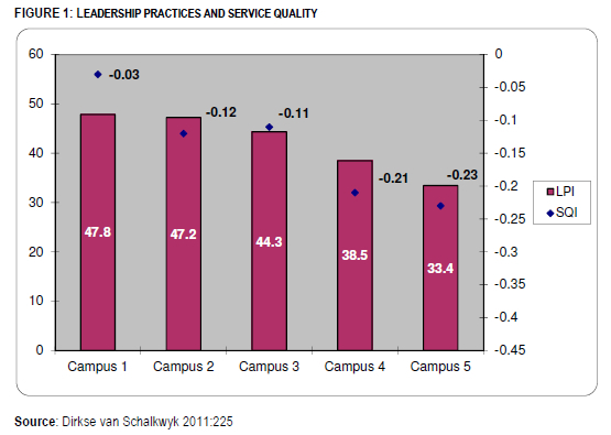 Figure 1 indicates that Campus 1 had the highest LPI and SQI scores. This is supported by the correlation coefficient calculated in Table 3, which indicated a strong positive linear relationship between leadership practices and service quality.
