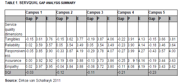 As indicated in Table 1, Campus 1 is perceived to render the best overall quality of service with a service quality gap of only -0.03. By contrast, Campus 5 seems to provide the worst service quality experience to its students with a service quality gap of -0.23. In terms of overall individual service quality dimensions, tangibles and responsiveness appear to represent the largest quality gaps.