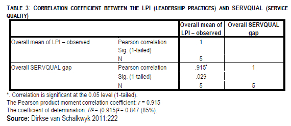 The correlation between leadership and service quality is calculated by using the SERVQUAL scores (mean SQI score) and LPI scores (mean observer scores). For the purpose of this study, only the LPI observer scores were used.
