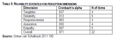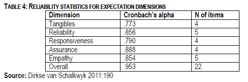 Tables 4 and 5 below represent the Cronbach's alpha coefficient for both the expectation and perception dimensions of the SERVQUAL instrument.