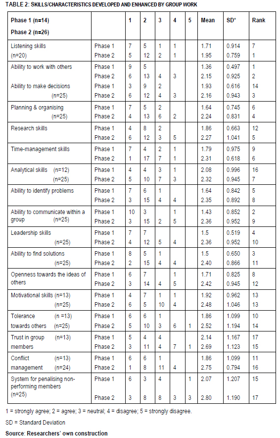 In both phases of the study students were asked to rate, on the scale from strongly agree (1) to strongly disagree (5), the following skills/characteristics which are developed and enhanced by group work (see Table 2). Mean scores and standard deviation are used to rank the factors.