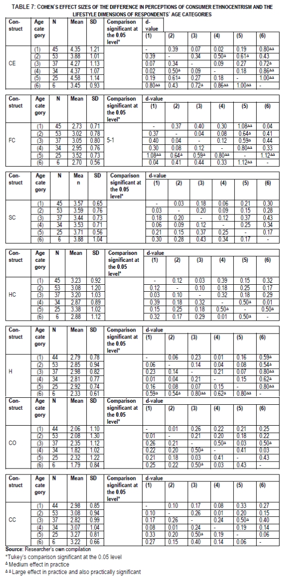 From Table 7 it is evident that medium and significant effect sizes were found between the age categories of respondents and the constructs of consumer ethnocentrism, fashion consciousness, self-consciousness, health consciousness, homemaking, community orientation and cost-consciousness. The following practically significant results were found:
