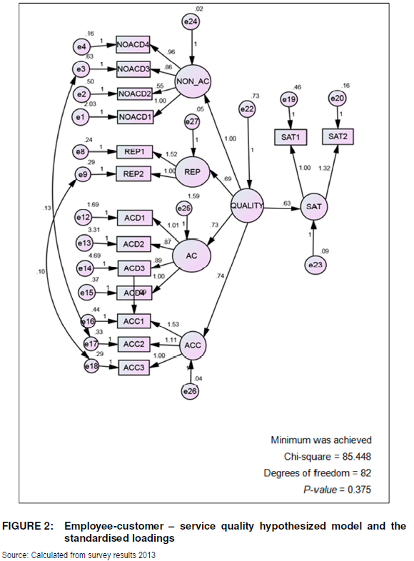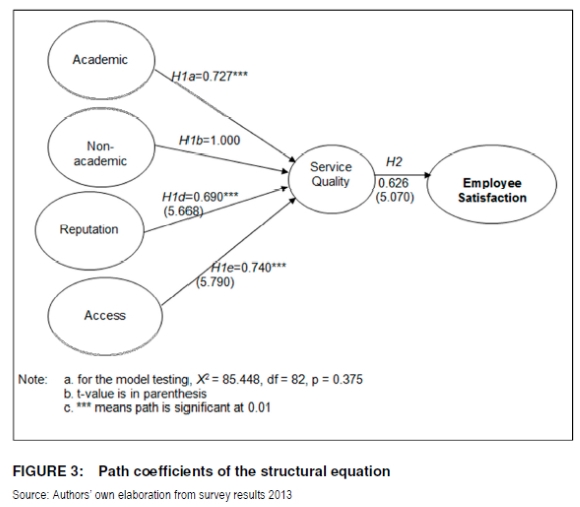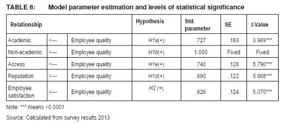 Furthermore, the aforementioned results are positively related to Firdaus' (2006:42-43) determinants of SQ, where the academic and non-academic characteristics were found to be important quality indicators, and thus confirming the views of earlier researchers (Leblanc & Nguyen 1997:72-79; Soutar & McNeil 1996:72-82). The statistical results also confirm H2, in that the employees' perceived service quality is related to their satisfaction, since the path coefficient is 0.626 (t=5.070; p<0.0001).