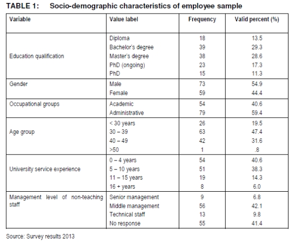 Of the 250 questionnaires administered, 133 were usable, which represents are response rate which exceeds 50%. Table 1 shows that the majority (59.4%) of the employees (respondents) were in administrative positions, and academics comprised 40.6% of the sample, and of these, 54.9% were male and female comprised the rest.