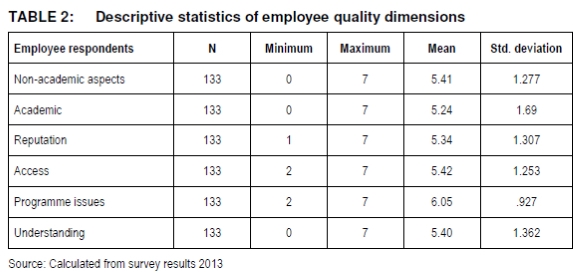 Further, the measures of central tendency (mean=M) and dispersion (standard deviation=SD) for the service quality dimension measures in respect to academic and non-academic employees are shown in Table 2.
