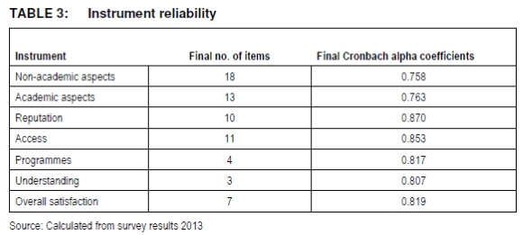 Recognising the difficulties associated with using the SERVQUAL instrument to measure service quality in the higher education environment, Firdaus (2005:575) presented six sub-dimensions of service quality, and conceptualised the HEdPERF model, which has increased in use in the last decade as measure for service quality in the context of HE. Firdaus (2006:37-38) modified the HEdPERF instrument to a six factor structure with 41 items, since it was argued that HE has clear and distinct dimensions, namely; academic aspects, reputation, non-academic aspects, access, program issues and understanding. Although some researchers, inter-alia, (Kimani, Kagira and Kendi 2011:102-103; Mang'unyi & Govender 2014:2743-2744) have demonstrated its validity and reliability in a Kenyan population, there is still room for improving the HEdPERF instrument.