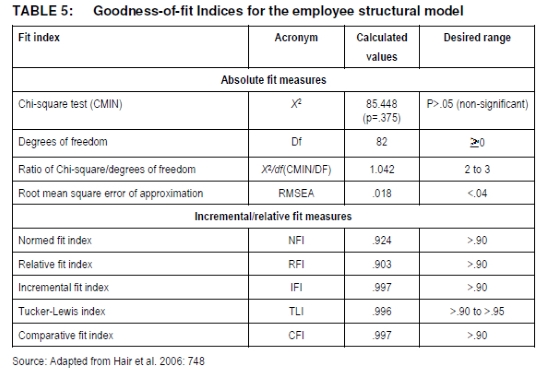Furthermore, the structural equation modelling was conducted and evaluated on the basis of goodness of fit indices which are reflected in Table 4, inter alia, the comparative fit index (CFI), root mean square error of approximation (RMSEA) and the ratio of Chi-square value to the degrees of freedom (CMIN/DF) ratio (Hoe 2008:77-78).The CFI value exceeded 0.95, which showed the model fitted the data well.