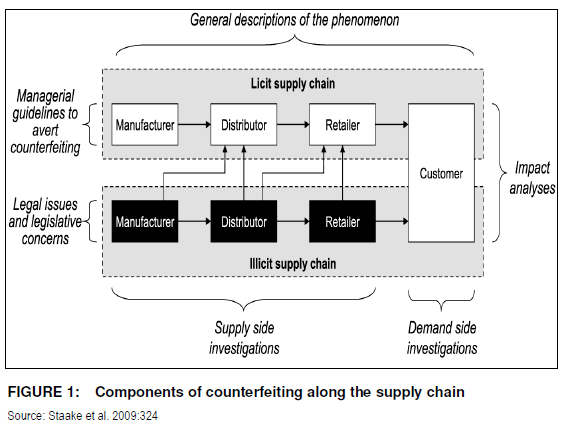 Staake, Thiesse and Fleisch (2009:324) structured a broad framework for understanding counterfeiting, which is illustrated in Figure 1. This study is structured around six categories, and provides insight into the relationship between the licit and illicit supply chain.