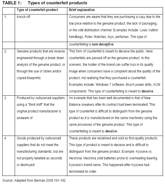 Berman (2008:191) states that counterfeit products can be classified into four types as outlined in Table 1. Penz and Stöttinger (2005:568) identify two different forms of counterfeiting: (1) deceptive; and (2) non-deceptive counterfeiting.