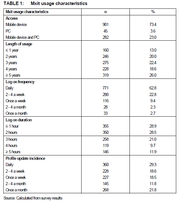 Firstly, five usage characteristics (access, number of years of usage, log on frequency, hours of usage per log on, and frequency of profile update) of Mxit users were determined by means of multiple-choice questions.