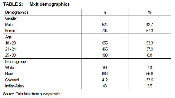 The survey included a majority of females (57.3%); and the ethnic groups fundamentally reflected the Western Cape's ethnicity (Statistics SA 2012:21). The demographics of the sample also portrayed Mxit's typical audience profile (Mxit 2014a:Internet).