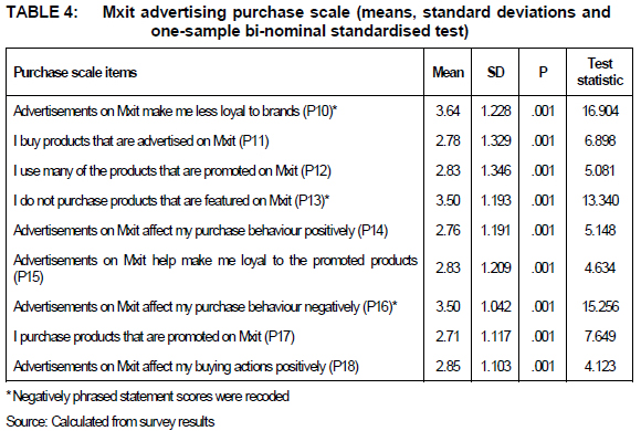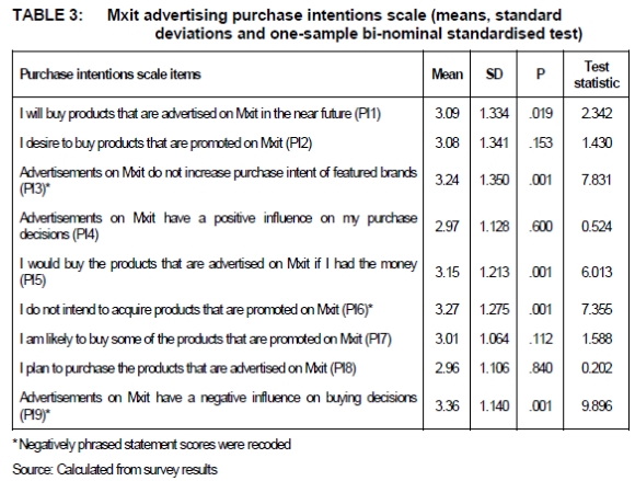 This indicates that participants tended to "agree" that Mxit advertising resulted in purchase intentions and purchase. A non-parametric one-sample bi-nominal standardised test was also employed to ascertain whether there was a significant difference in terms of the individual construct items.