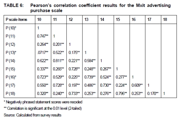 As mentioned in the methodology section, the participants' purchase intentions and purchase sentiment towards Mxit advertising was calculated by means of nine-item scales for each of the hierarchy response levels (Tables 3 and 4). Likert scale statements that are negatively phrased are essential to minimise response bias, but it is imperative that these statements' scores are reversed; otherwise it would have a negative influence on the Cronbach's a value.