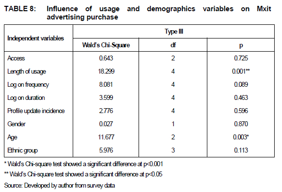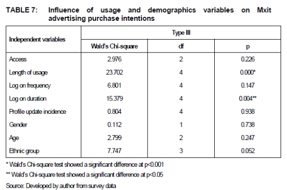 Larger standard errors are attributable to a lower number of observations, for example, there was a much greater number of participants aged 18 - 20 compared to the 25 - 30 years group (van Schalkwyk 2012:3). Tables 7 and 8 display the influence of usage and demographics variables on Mxit advertising purchase intentions and purchase with regards to Wald's Chi-Square tests, which were founded on the Bonferroni correction pairwise post hoc test among the estimated marginal means.