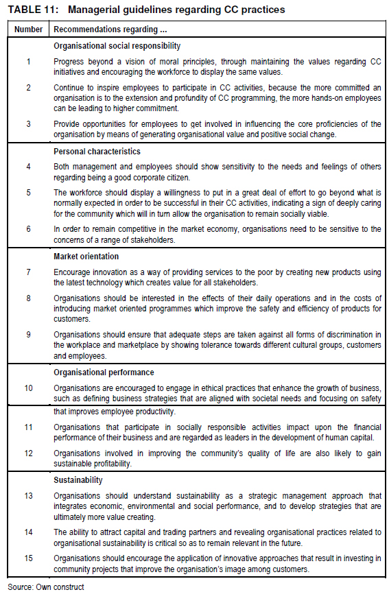 There should be total commitment from all in the organisation toward CC behaviour planning strategies and that the vision and mission must be centered on conducting business in a socially responsible manner. Top management must be highly supportive of the CC engagements of organisations. Organisations must have the financial resources as well as human capacity to engage in CC initiatives. Table 12 highlights some general guidelines regarding CC implementation.