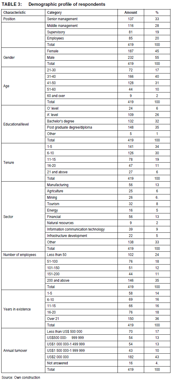 Table 3 summarises the demographic profiles of the respondents in this study and describes the demographic profile of the respondents of this study, according to the nine categorical variables. It shows that 51% of respondents are in senior or middle management positions. The majority were males (55%) between the ages of 31 and 40 (40%). Fifty-five per cent have a bachelors or post-graduate degree with tenure of 11 to 20 years (49%). Thirteen per cent are employed in both the manufacturing and financial sectors and 35% are employed in organisations with 200 or more employees. Thirty-four per cent are employed in organisations that have been in existence for 11 to 20 years and 43% have a turnover in excess of US$2 000 000.