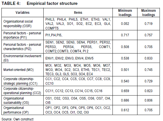 All six items expected to measure 'organisational performance' and all five items expected to measure 'organisational competitiveness' as well as three of the five items (OI1, OI2, OI3) expected to measure 'organisational image' loaded on factor four (4) and were termed 'organisational performance'. All the items that loaded onto factor 5 were deleted due to the lack of sufficient validity for further analysis. Based on these findings, the hypotheses were reformulated and the hypothetical model adapted. The empirical factor structure was then subjected to regression analysis.