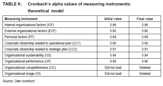 The internal consistency of each of the factors was assessed by calculating Cronbach's alpha and the value >0.8 was considered to represent a sufficient standard of reliability in this study. Table 6 indicates that the Cronbach's alpha values obtained in this study were all above the cut-off point of 0.8 except for the organisational image (OI) and organisational competitiveness (OC) variables which were regarded as inadequate for further analysis and were subsequently deleted from the empirical model.