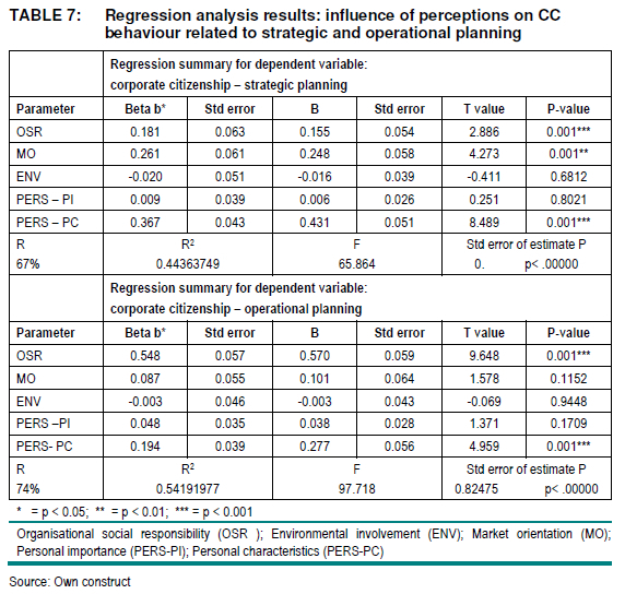 Table 7 indicates the regression analysis results of the influence of management and employee perceptions on CC related to strategic and operational planning. Table 7 indicates that there is a statistically significant relationship between organisational social responsibility, personal factors measured by personal characteristic dimensions (individual personality, sensitivity and commitment) and market-orientation and corporate citizenship related to strategic planning.