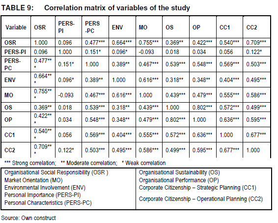 Table 9 indicates correlations between the variables of the study.