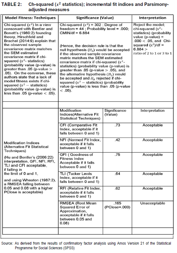 The techniques and indices which were used in determining model fitness include Chi-Square (x2) analysis. The analysis of the modification indices encompassed the application of the root mean residual (RMR), comparative fit index (CFI), Tucker Lewis index (TLI), normed fit index (NFI) and the root mean square error of approximation (RMSEA) (Steinberg 010:20). David's (2014:75) interpretation was used in determining whether the results of GFI, PNFI, TLI and CFI were within acceptable limits of 0 and 1. As cited in Bollen and Davis (2009:523), Carmnines and McLver's (1981:1) and Wheaton (1987:2), arguments were used in assessing whether the RMSEA (root mean square error of approximation) fell in the acceptable limit of 0.05 and 0.08.