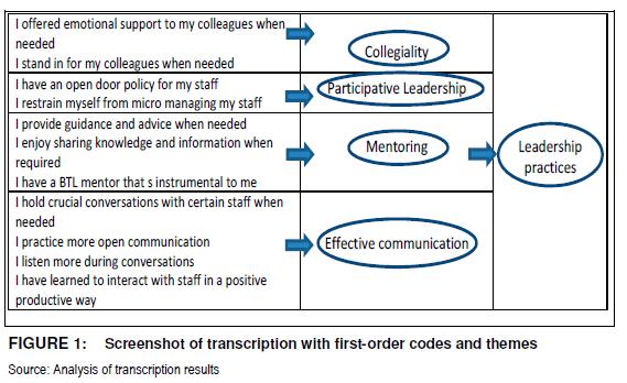 Tesch's method of open coding was used for this analysis (Creswell 2009:86). Themes, which included recurrence, forcefulness and repetition of words, phrases, sentences and statements, were identified, guided by Owen's criteria for thematic analysis (Owen 1984:280). An interaction of the final analysis of first-order codes, sub-themes and themes is indicated in figure 1 below. The more detailed analysis of codes and themes is attached.