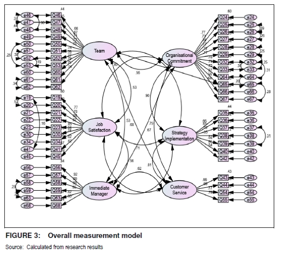 A confirmatory factor analysis (CFA) was conducted in order to develop and specify the measurement model (Hair et al. 2010:646) on the first-order latent construct level. The AMOS (Analysis of Moment Structures) computer program was used to conduct the CFA.