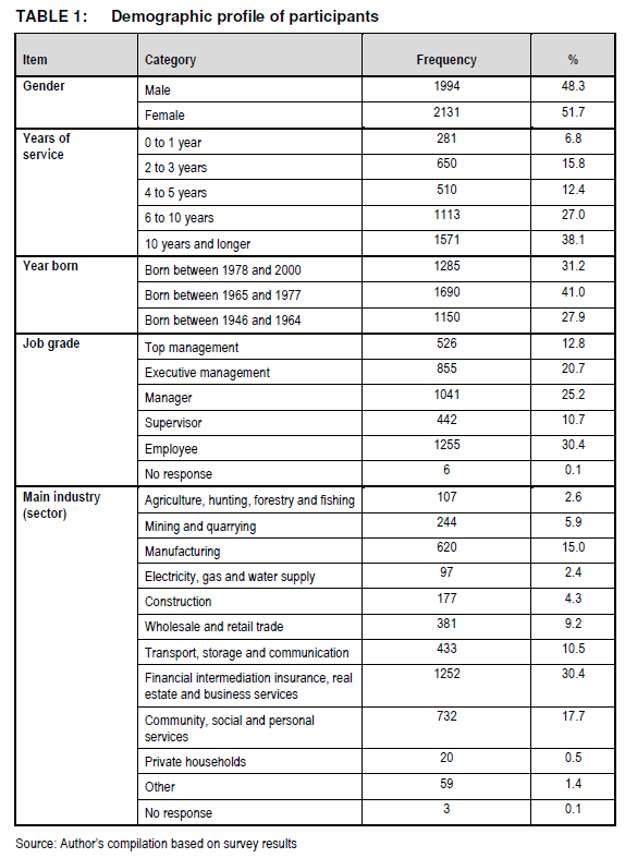 The sample comprised 48.3% male and 51.7% female participants, while the largest generational group (41.0%) was born between 1965 and 1977, the typical Generation Xers. The variable on job grades showed that most respondents were employees i.e. not managing or supervising positions (30.4%), followed by managers (25.2%) and executive managers (20.7%). It is interesting to note that 38.1% had more than 20 years of service.