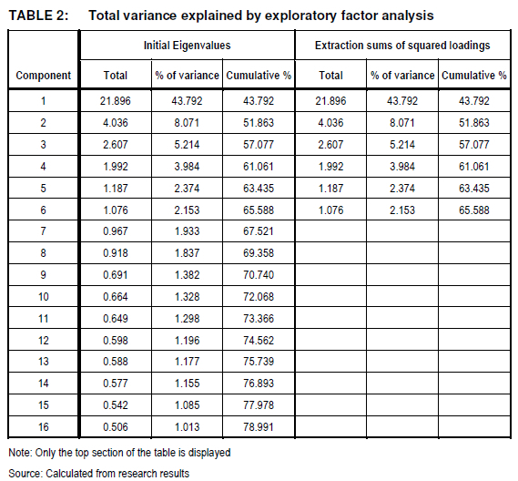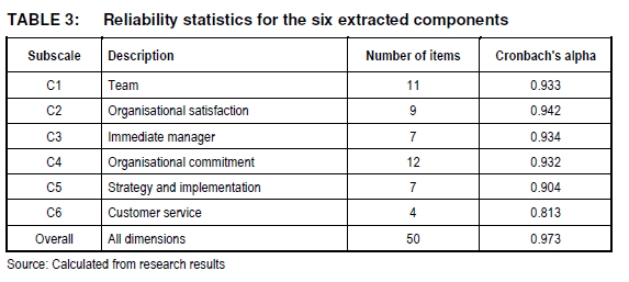 Oblique rotation was used to accommodate the correlation among the components. Excluding factor loadings of less than 0.3 resulted in a reasonably simple structure (Thurstone 1947), with each of the six components showing a number of strong loadings, although there is a number of cross-loading situations that need careful interpretation. According to Hair et al. (2010:118), the generally agreed lower limit for Cronbach's alpha reliabilities is 0.70. Each of the extracted constructs demonstrates strong internal consistency, well above 0.70, as illustrated by the Cronbach's alpha coefficients listed in Table 3.