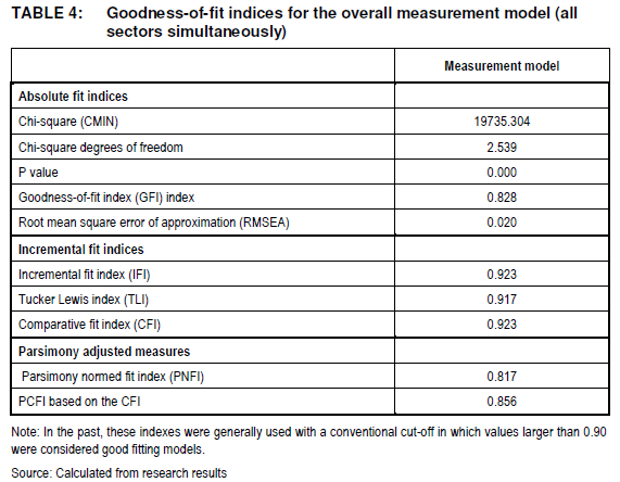 The indices of the 5 sectors model were at the levels recommended by various researchers in the field (Hair et al. 2010:672; Hu & Bentler 1999: 1).